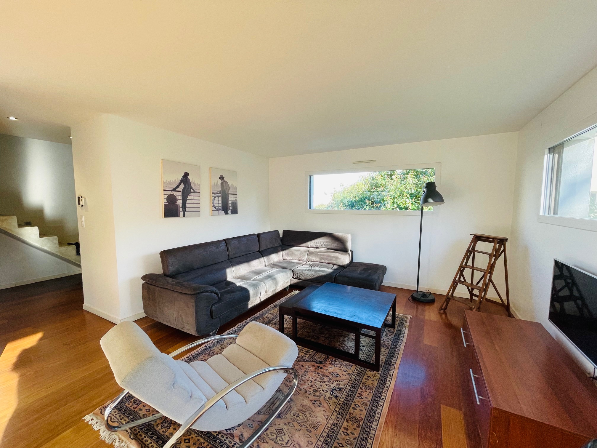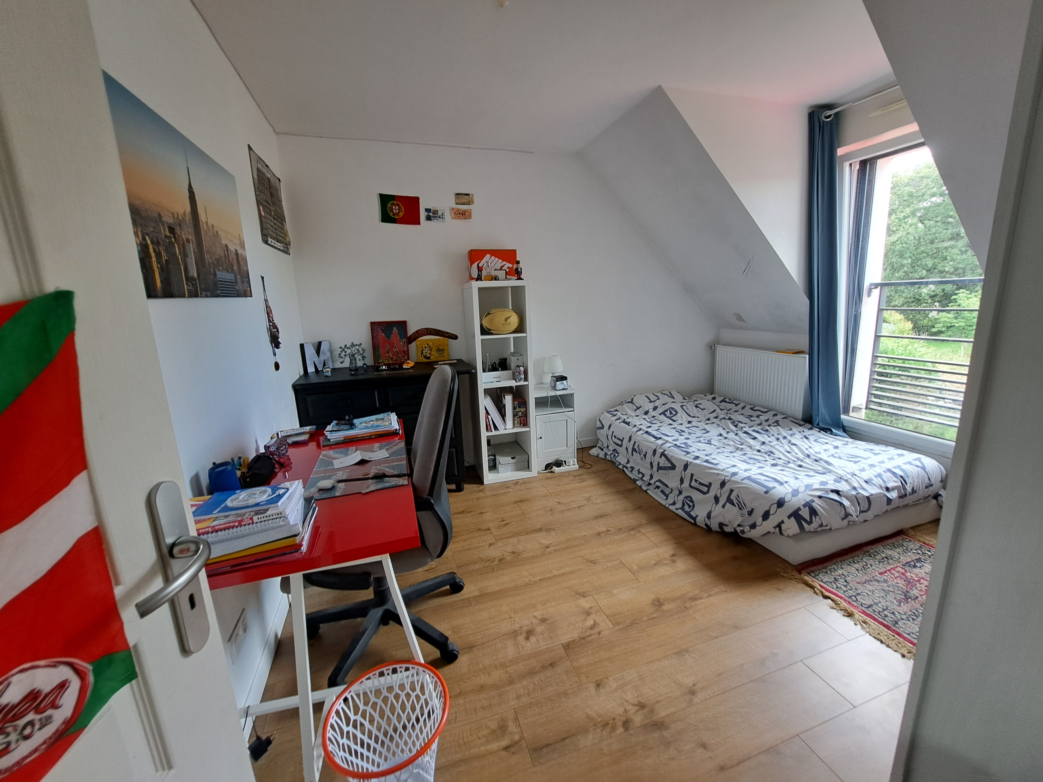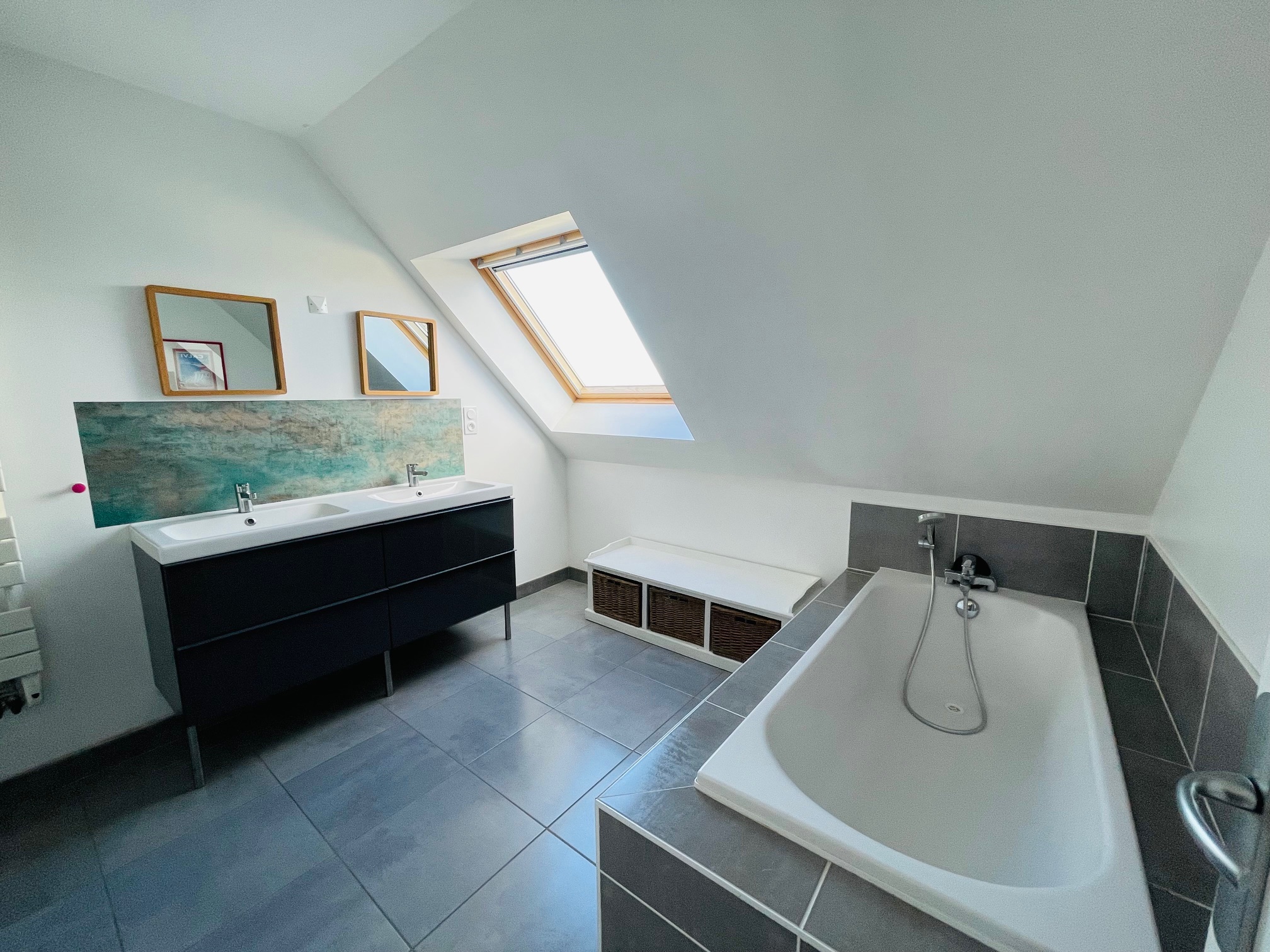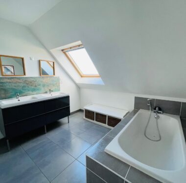-A l’étage : un palier avec coin salon, trois chambres dont une avec placards, une salle d’eau avec baignoire et douche et wc séparé.