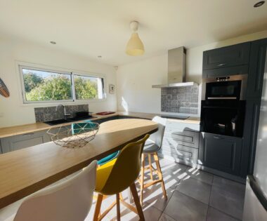 -Au rez-de-chaussée : une entrée avec placards, wc avec lave-mains, un salon-salle à manger traversant, une cuisine aménagée et équipée, une arrière-cuisine et un garage.